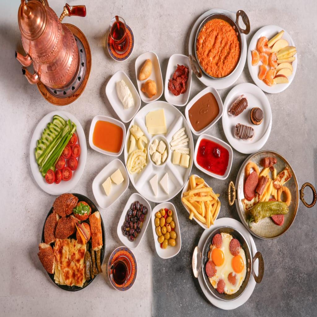 Peynir tabağı, siyah zeytin, yeşil zeytin, reçel çeşitleri, bal, kaymak, tereyağ, söğüş tabağı, börek tabağı, kızartma, kızartma tabağı, menemen, sahanda sucuklu yumurta ve termos çay ile birlikte.)